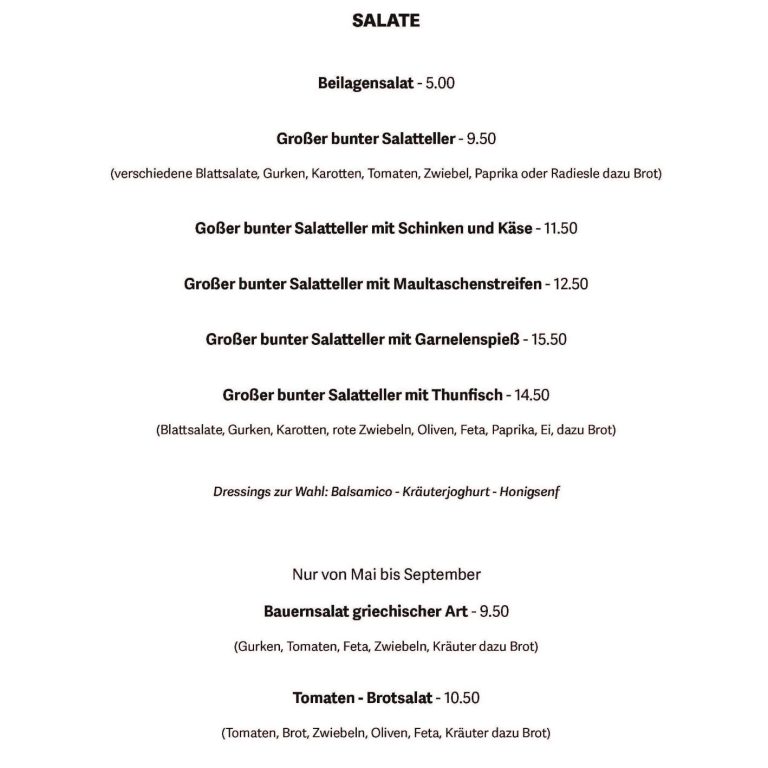 Große Karte mit Salaten oder Hauptspeisen nur Samstag und Sonntag.